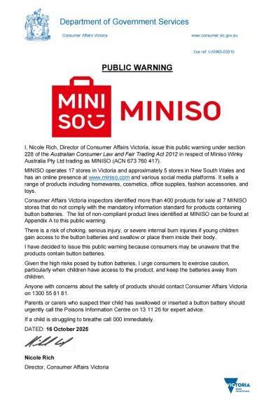 据澳大利亚零售行业媒体 Inside Retail 报道高升网,名创优品(Miniso)违反纽扣电池相关强制信息标准,维多利亚州消费者事务局(Consumer Affairs Victoria)近日查获了其超过400件不合规产品。